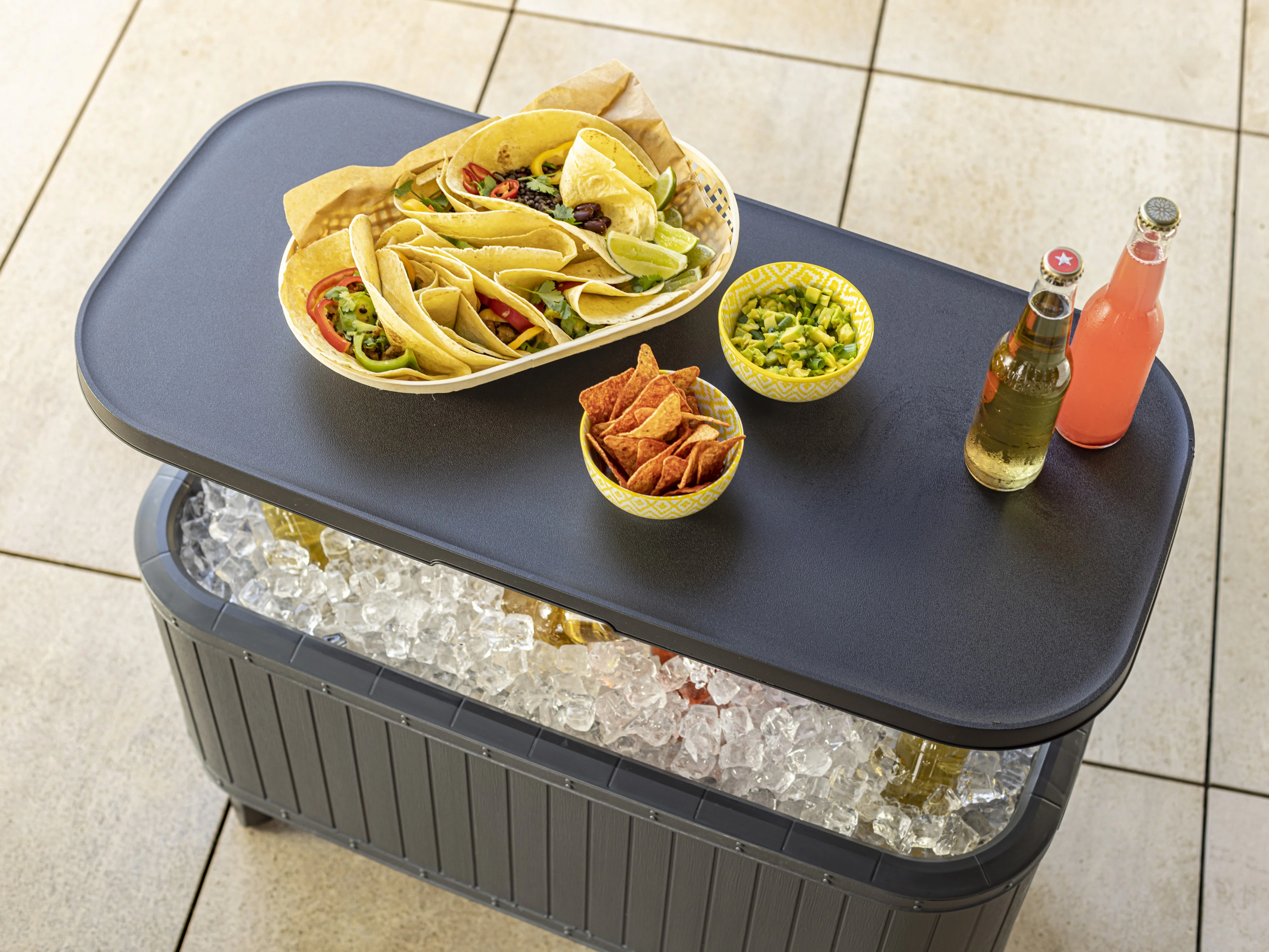 Once the party ends, you can close your outdoor cooler bar in a single press, transforming it from a multifunctional party drinks cooler box to a side table that neatly fits with the rest of your backyard furniture. The Bevy Bar ice chest is made of weatherproof, UV-protected resin, so while it looks similar to a wooden bar cooler, it’s more durable and won’t fade in the sun. It’s the perfect outdoor drinks cooler, no matter the season!