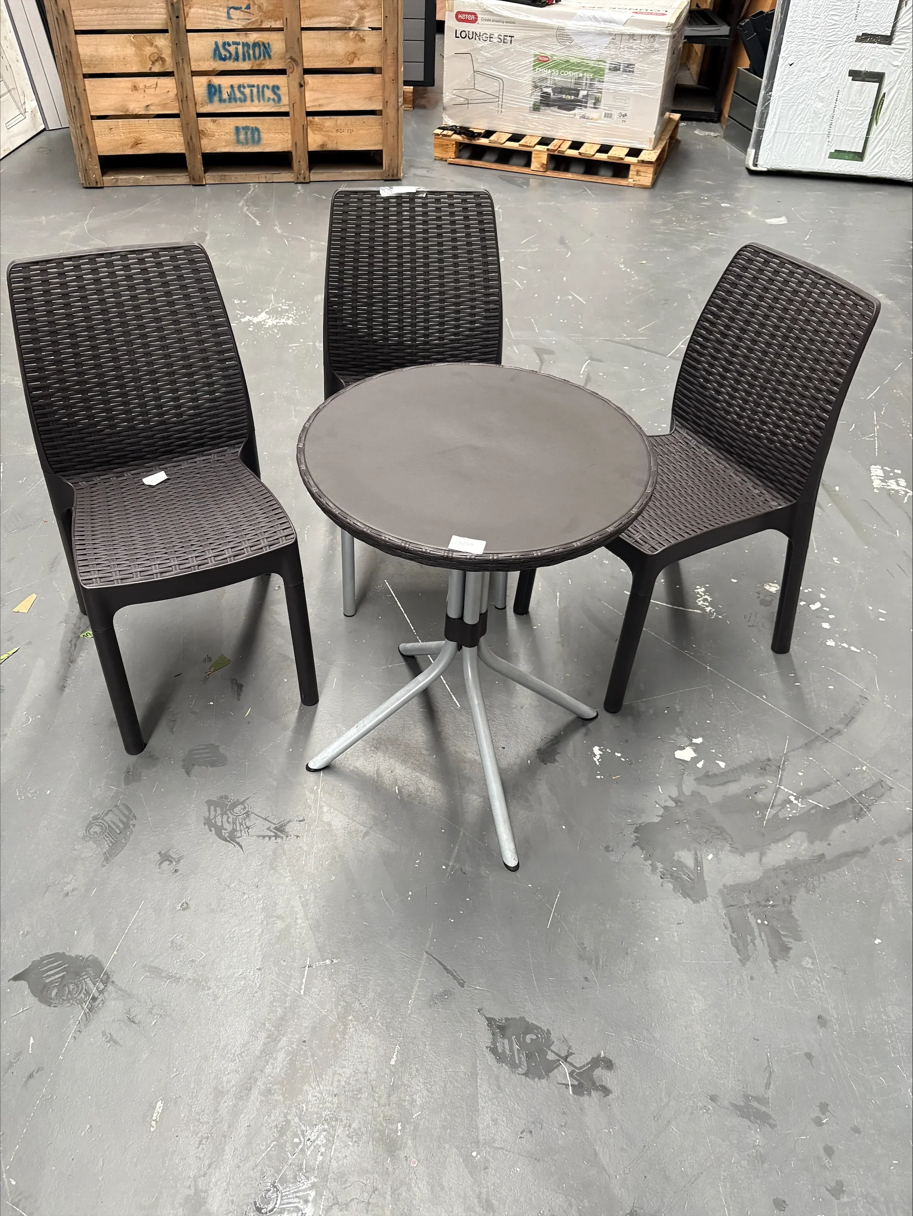 Add a touch of British class to your pool or patio area with the Chelsea bistro set. This set comes complete with three elegant curved chairs and a matching round table. Relax with friends or enjoy a quiet afternoon cup of tea on your patio with this versatile and modern set. The chairs feature a stylish combination of materials: wicker-effect resin and metal legs. The tabletop is made out of a sturdy, durable material that is UV-protected so it won't fade or bleach in strong sunshine.
