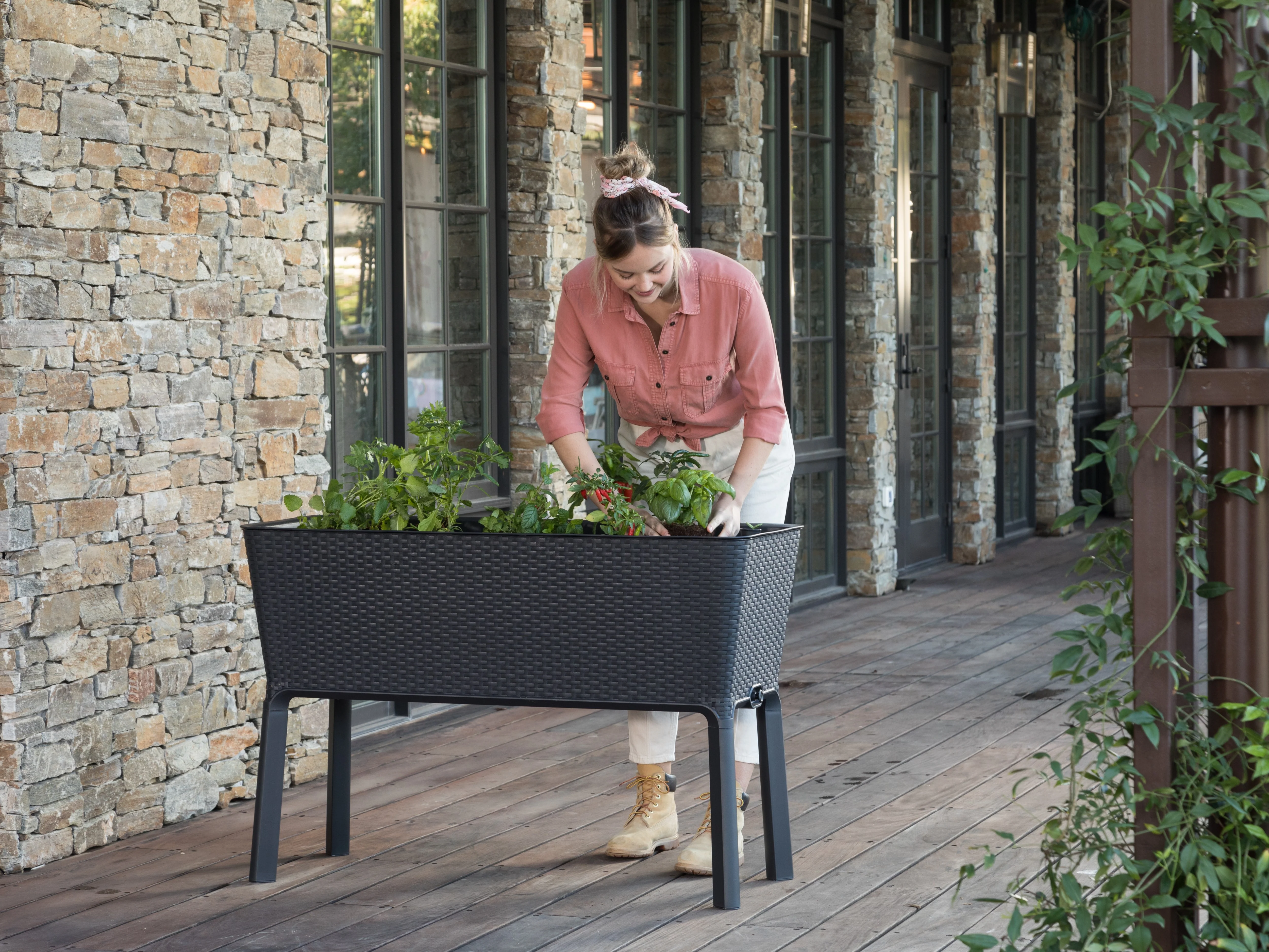 The Keter Full Bloom Elevated Garden makes it easy and fun to garden no matter where you live. With generous capacity of 120 litres, you’ll have enough room to grow a variety of vegetables, herbs, flowers or even houseplants. The Full Bloom Elevated Garden is an ergonomically designed elevated planter that is easy to use. Perfect for small outdoor spaces, this attractive raised planter is an ideal solution for bringing color to decks, patios, and balconies. Made of polypropylene resin in a rattan pattern that matches current trends in patio furniture, this bed is both stylish and durable enough for use over many seasons.
