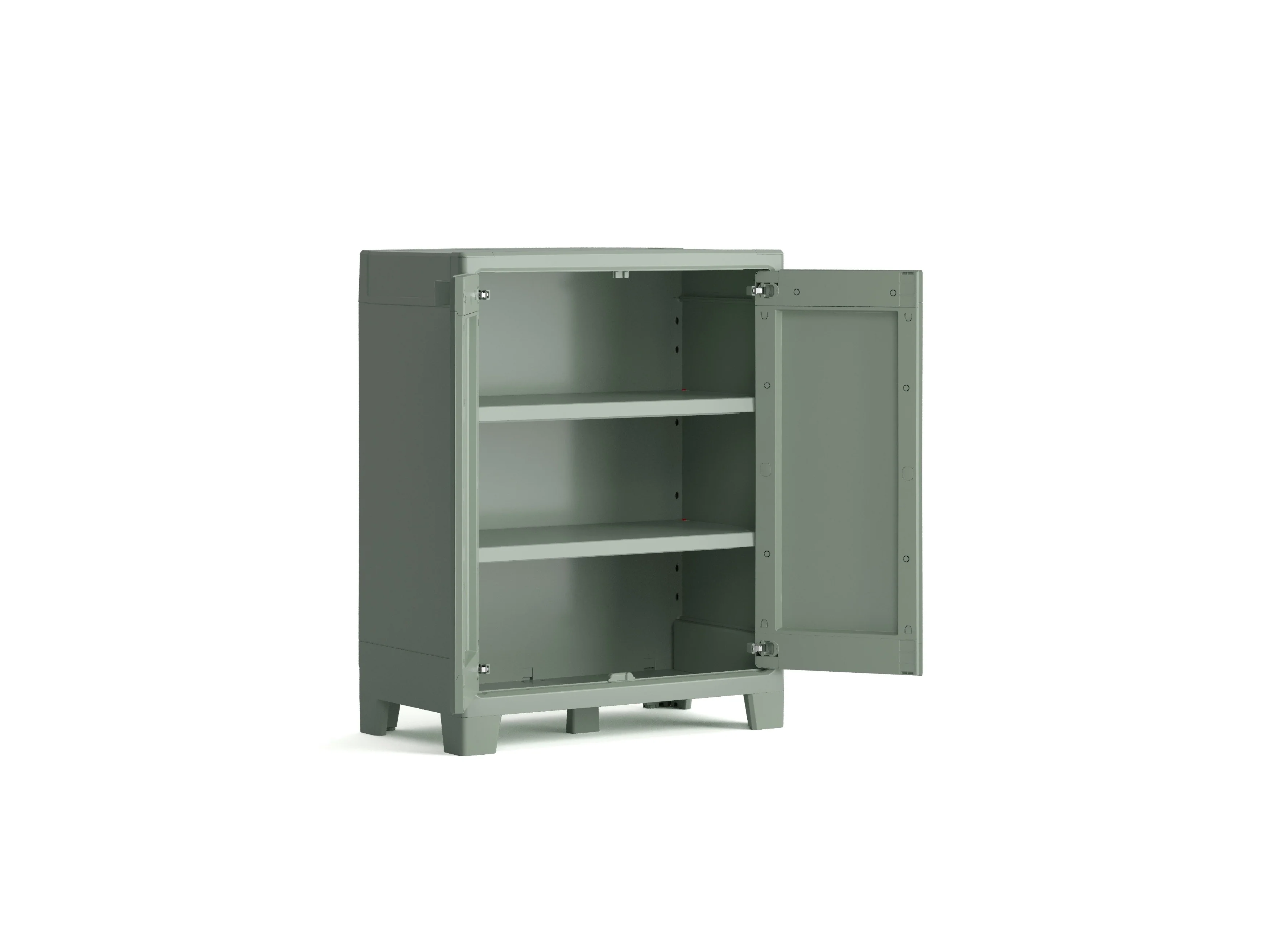 Bring a little bit of style to your storage spaces. The Planet Outdoor Base Cabinet combines soft lines with sturdiness and a water tight and UV resistant structure. Made of more than 80% recycled plastic, it is a sustainable way of organizing your home space. With two adjustable shelves, with a loading capacity of 30 kg each, and a reinforced bottom, holding 30 kg, this cabinet easily stores your items and protects them thanks to its lockable doors.