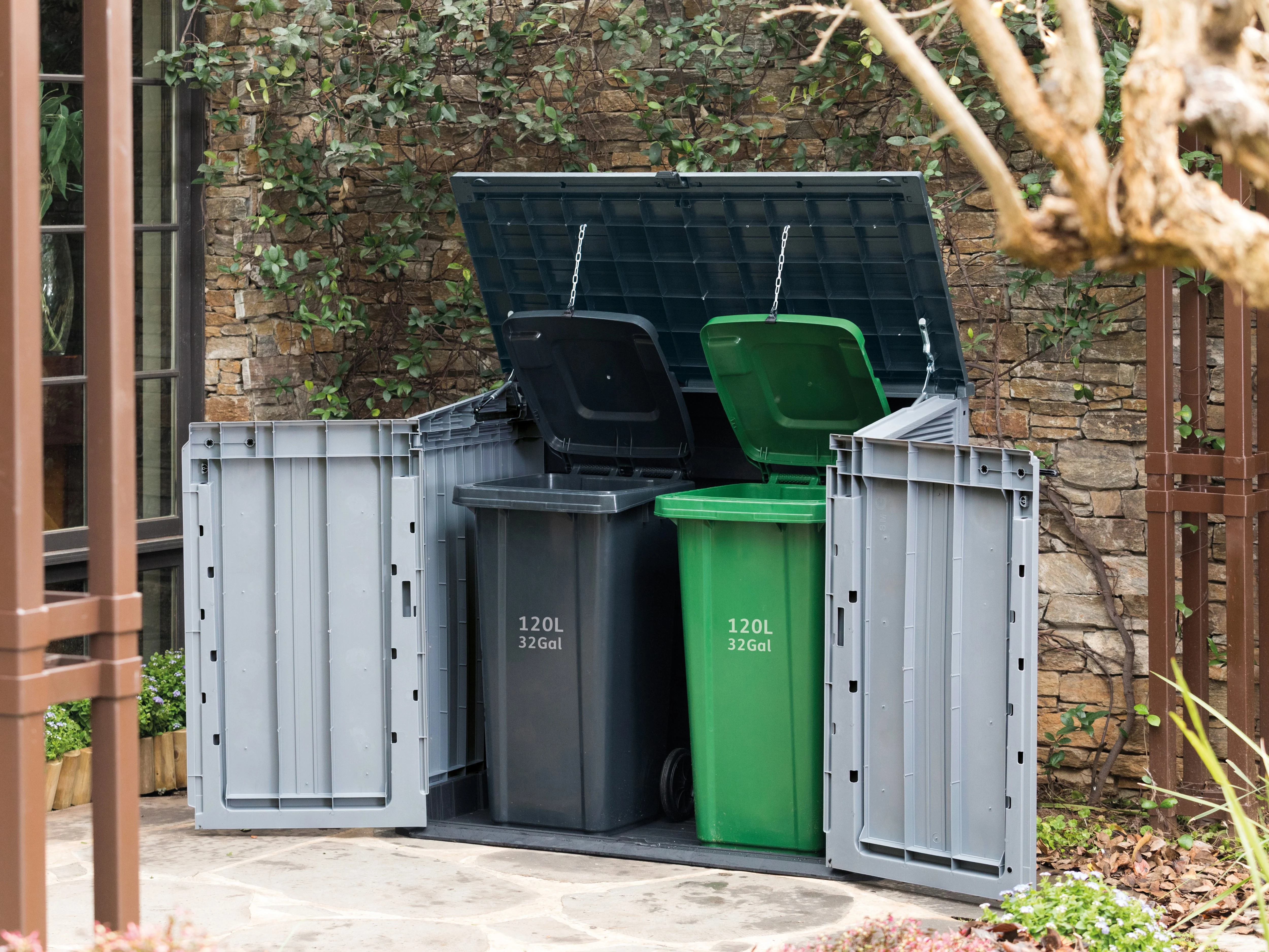 - Includes bin-opening kit that raises trash bin lids when storage unit top is lifted